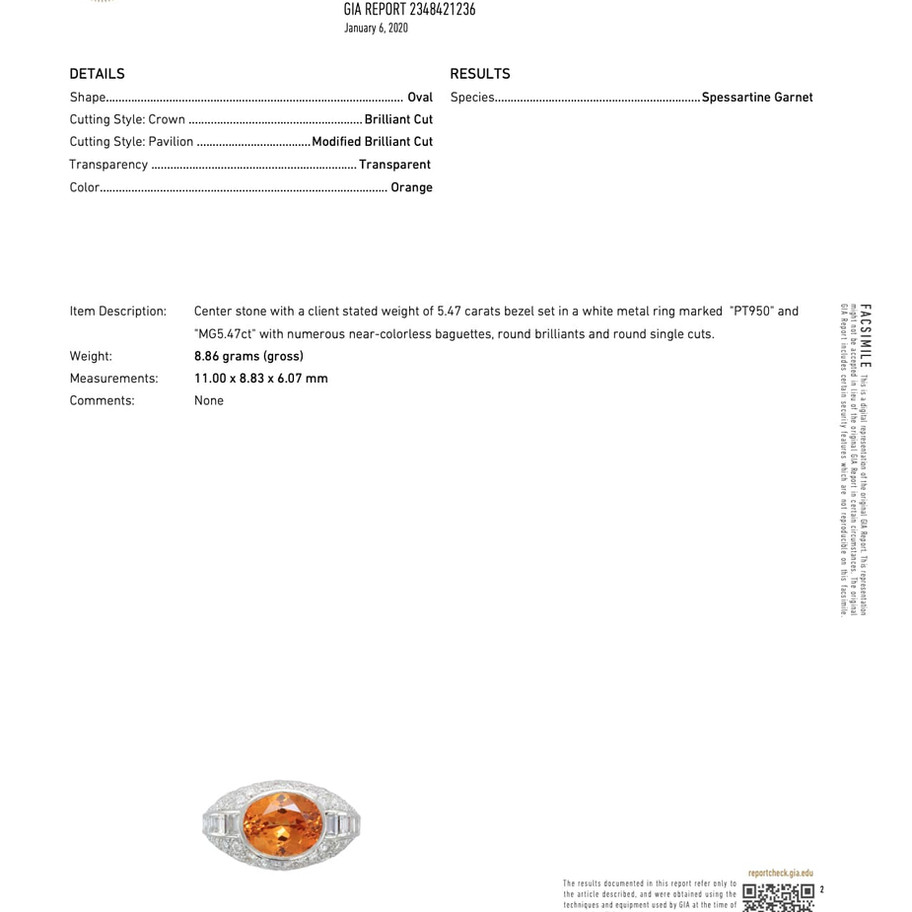 Fanta-orangefarbener Mandarin-Granat in ovaler Fassung in einem antiken Platinring mit runden Diamanten im Brillant- und Baguetteschliff. Dieser Granatring verleiht jedem Look ein luxuriöses Update.
